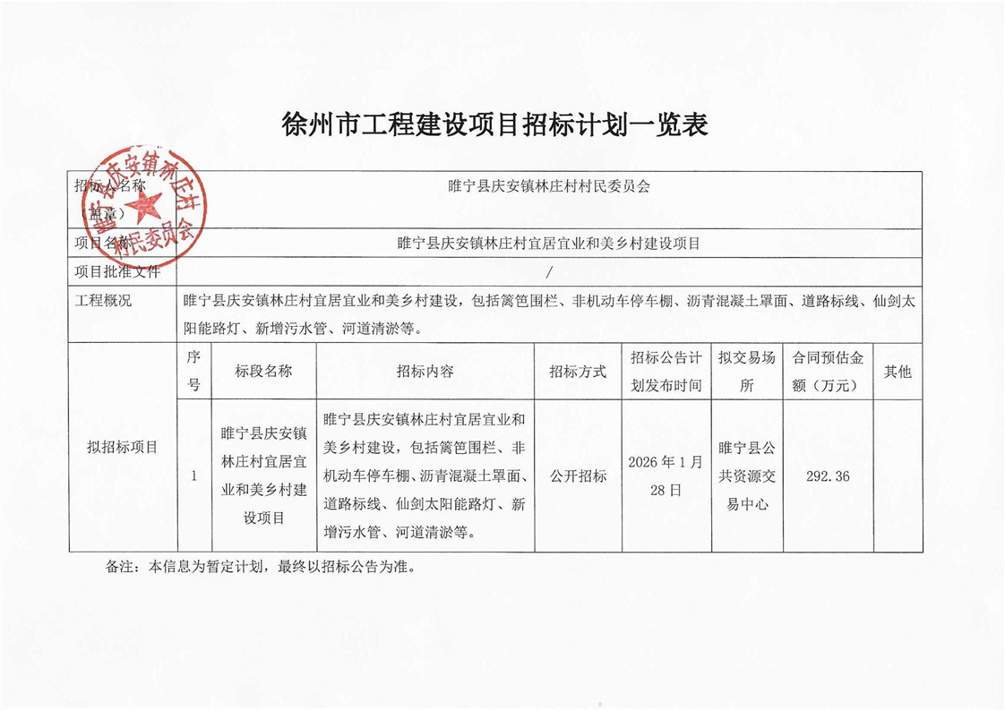 睢宁县庆安镇林庄村宜居宜业和美乡村建设项目招标计划