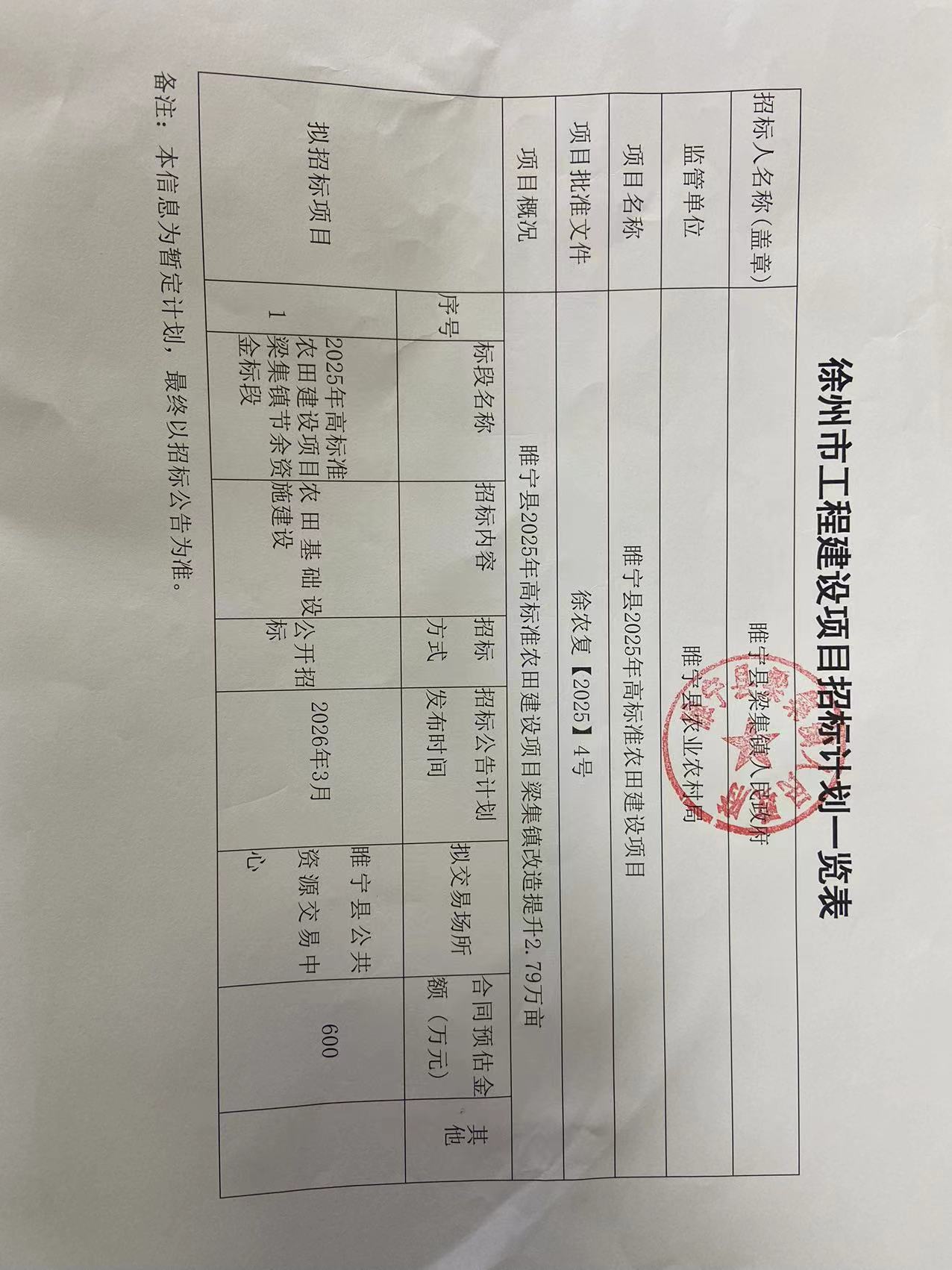 2025年高标准农田建设项目梁集镇节余资金标段招标计划