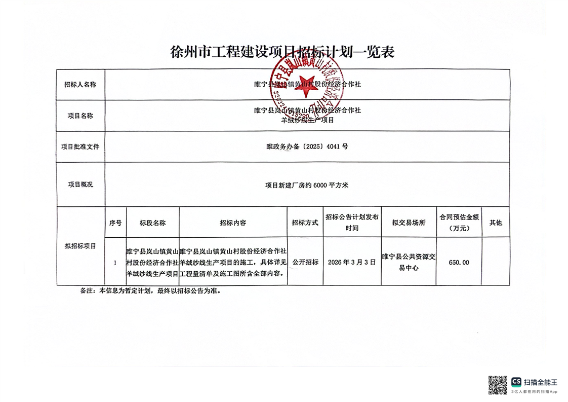 睢宁县岚山镇黄山村股份经济合作社羊绒纱线生产项目招标计划